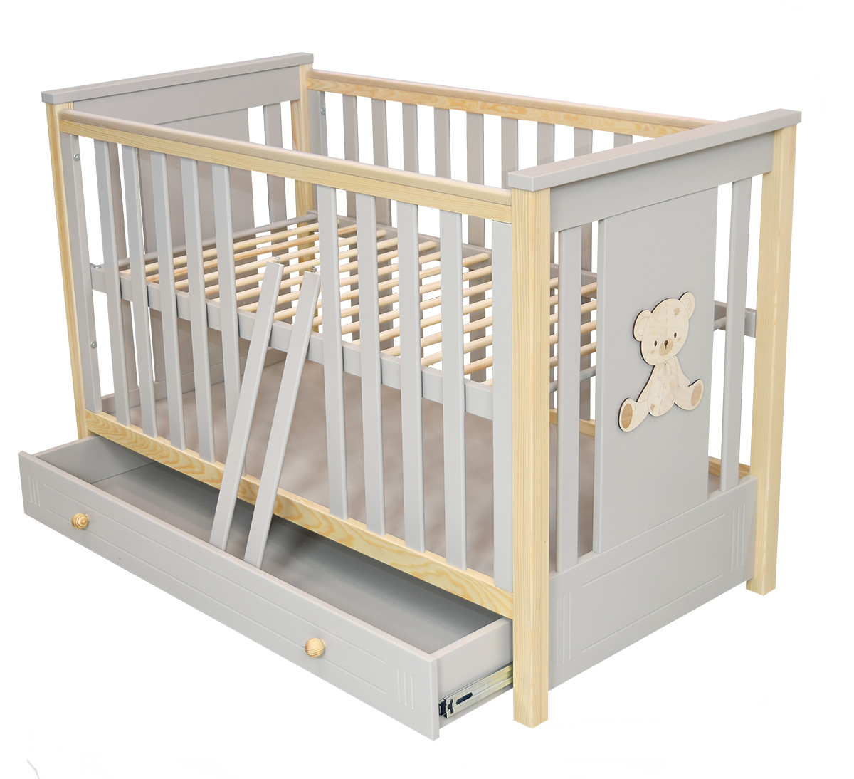 - Krótkie boki łóżeczka zabudowane , nogi pogrubione, boki ozdobne- naklejany motyw misia wykonany ze sklejki lakierowanej, dolna część boków z ozdobnym filunkiem ( ozdobny frez )