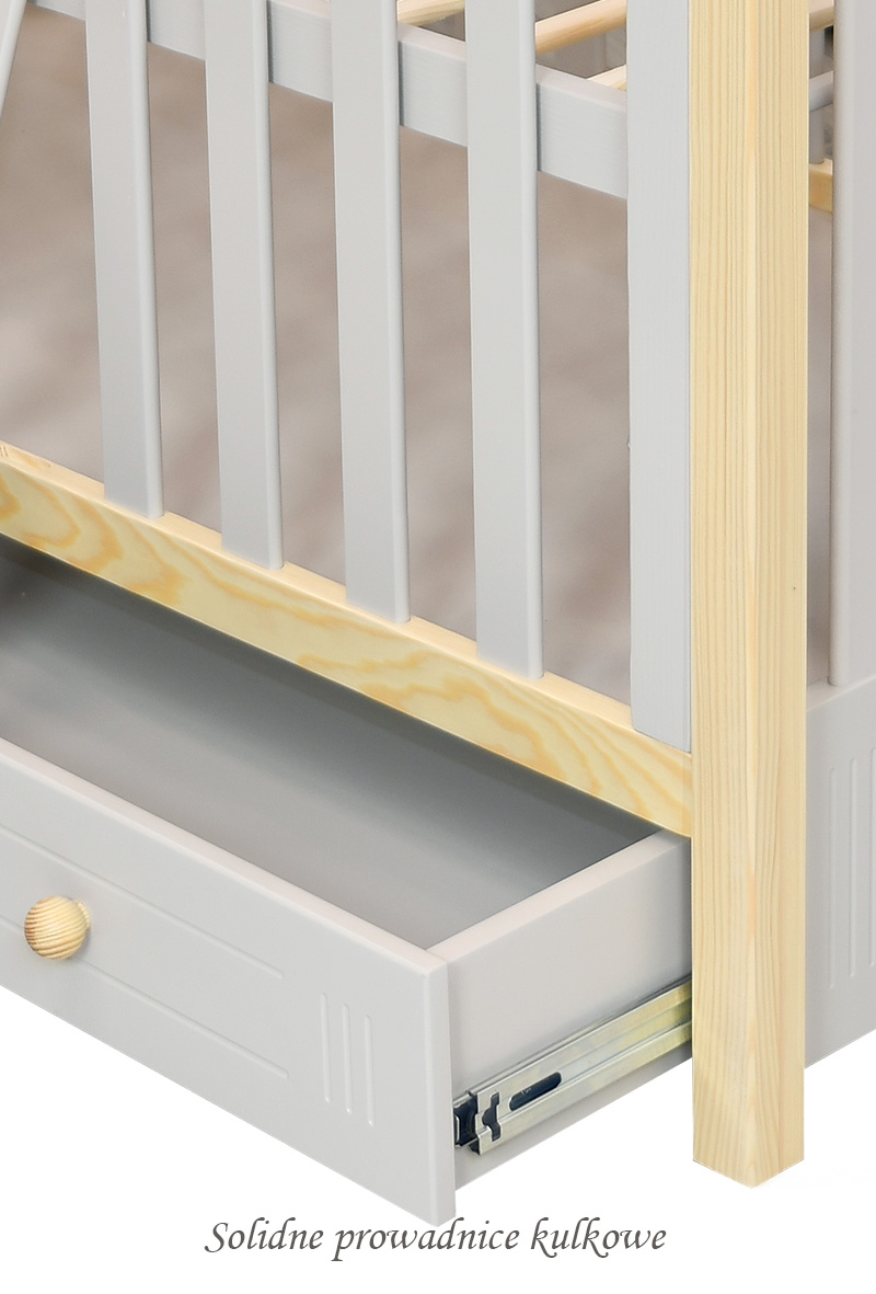 - W dolnej części szuflada na prowadnicach KULKOWYCH, idealna na wiele rzeczy dziecka, wykończona frontem z ozdobnym frezem znajdującym się również na boku łóżeczka