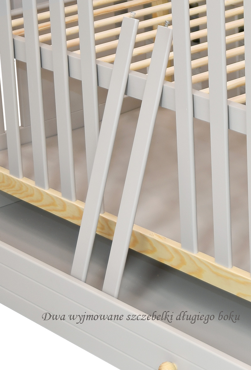 - Łóżeczko daje możliwość demontażu DWÓCH szczebelków – wtedy starsze dziecko może samodzielnie opuszczać łóżko bez pomocy rodziców.