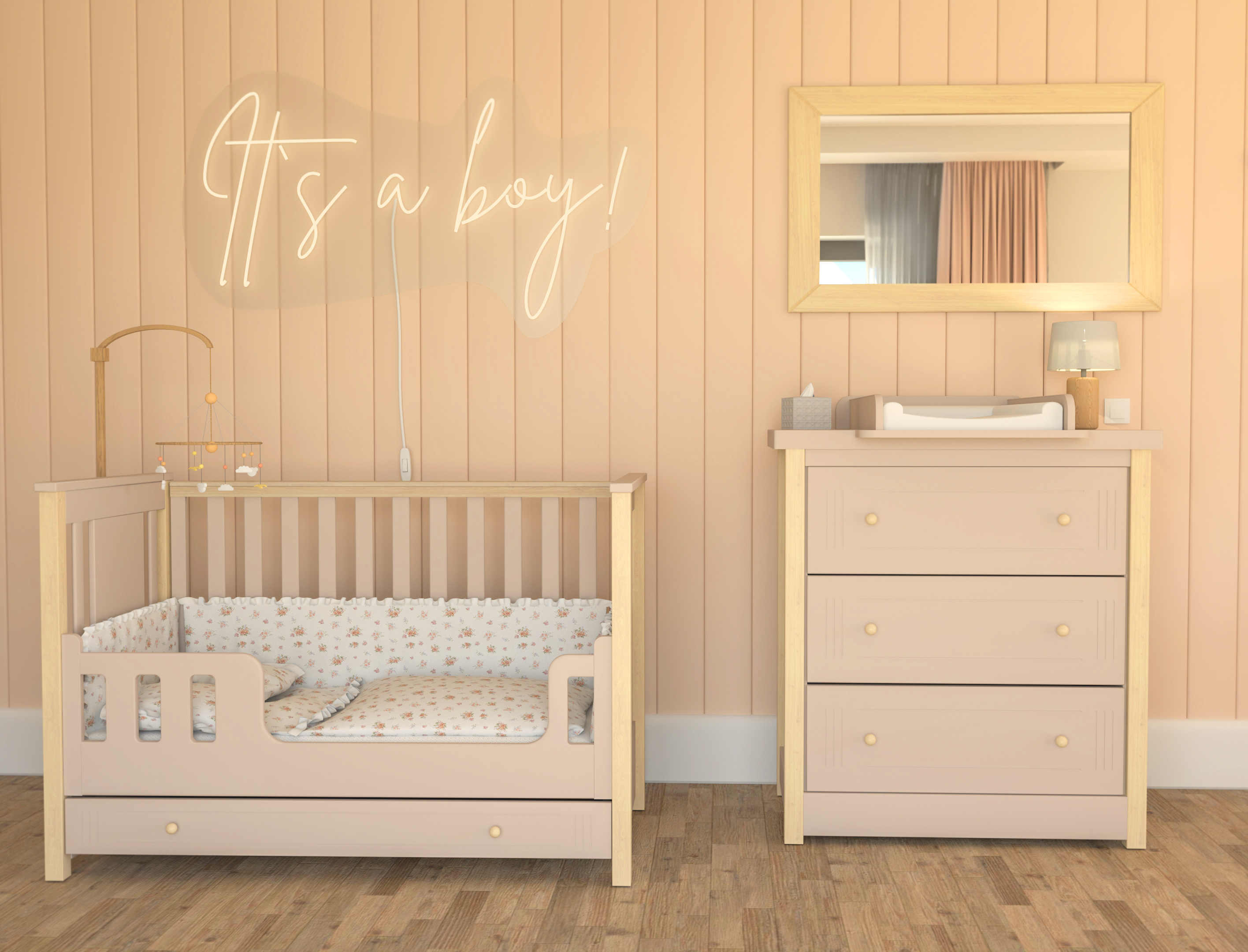 - Na blacie komody można założyć znajdującą się w zestawie nakładkę ,która powiększa blat i stanowi funkcję przewijaka z podniesionymi bokami co wpływa na bezpieczne i swobodne przebieranie dziecka