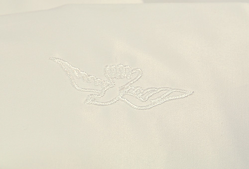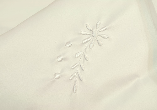 Poszycie został wykonane z białej bawełny satynowej, która wykończona jest uroczymi haftowanymi motywami – są one zaprezentowane na zdjęciach poniżej. Poszewka rożka zapinana jest na zamek i zdejmowana do prania. Becik wykończony jest także haftowaną koronką.