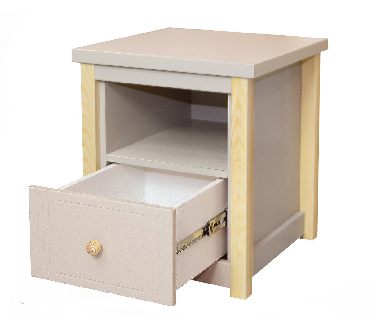Szafka nocna wykonana z wysokiej jakości płyty meblowej (gatunek I), płyty MDF lakierowanej i drewna sosnowego. Zaokrąglone kształty i jakość użytych materiałów zapewnia niepodważalne bezpieczeństwo dla małego użytkowania. Szafka nocna stoi na czterech nogach dzięki czemu jest bardzo stabilna a jednocześnie pozwoli na utrzymanie czystości nawet w tak trudnych miejscach. Szuflada montowana na prowadnicach kulkowych posiada pojemne wnętrze do przechowywania niezbędnych przy łóżku dziecka rzeczy.